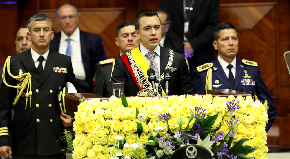 2023年11月23日,厄瓜多尔当选总统丹尼尔·诺沃亚(中)在首都基多发表就职演讲。新华社发(厄瓜多尔总统府供图)