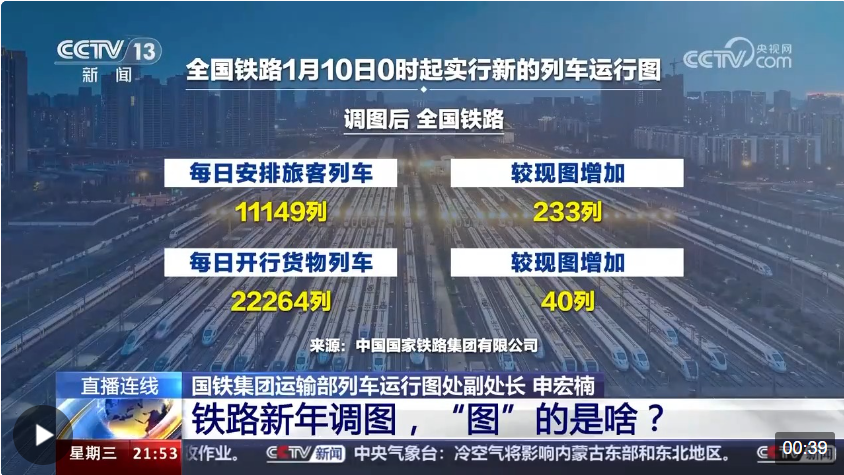 国铁集团运输部列车运行图处副处长 申宏楠:新图是于1月10日0时起实施,其实在1月7日已经进入到新图的过渡期。到目前为止,已经有80%的直通旅客列车完成了新旧图的过渡,剩余列车将在13日前完成新旧图的交替,整个交替过程总体来说还是非常平稳有序的。