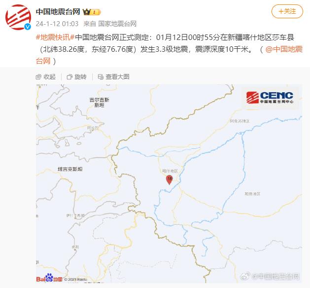 :中国地震台网正式测定:01月12日00时55分在新疆喀什地区莎车县(北纬38.26度,东经76.76度)发生3.3级地震,震源深度10千米。