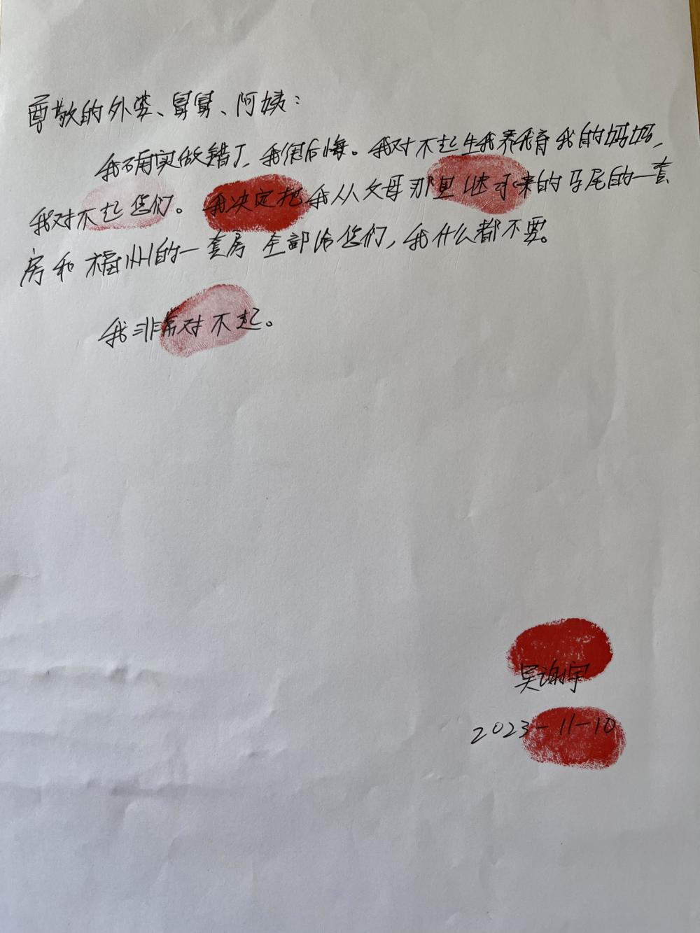 吴谢宇在一封亲笔道歉信中这样表示:“尊敬的外婆、舅舅、阿姨,我确实做错了,我很后悔,我对不起生我养我育我的妈妈,我对不起您们,我决定把我从父母那里继承来的马尾的一套房和福州的一套房全部给您们,我什么都不要,我非常对不起。”