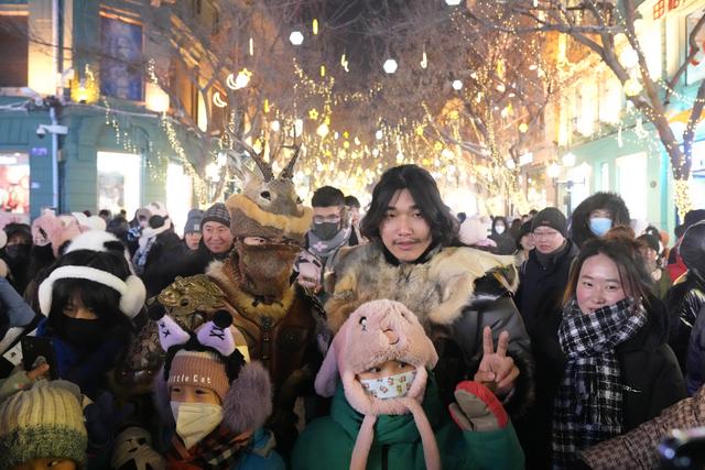 1月11日,身着民族服饰的达斡尔族青年(中右)在中央大街上与游客互动。新华社记者 王建威 摄