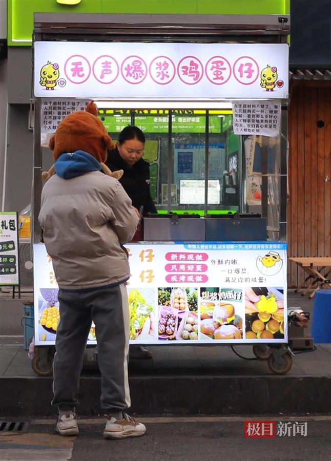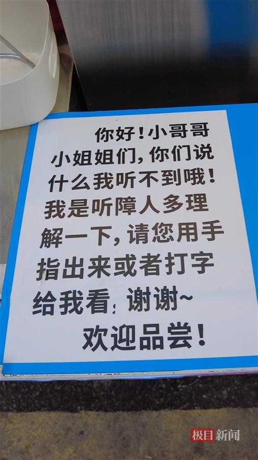 外卖小哥陈先生(化姓)站在摊前,用手机打字的方式与湛靖雯沟通。陈先生告诉极目新闻记者,他早已预订了四份鸡蛋仔,不过他不会同时拿走,而是等他想吃时才来取餐。“他们在这里摆摊后,我就一直在照顾他们的生意,他们面对生活的态度触动到我,在哪儿都要吃东西,所幸就支持他们。”