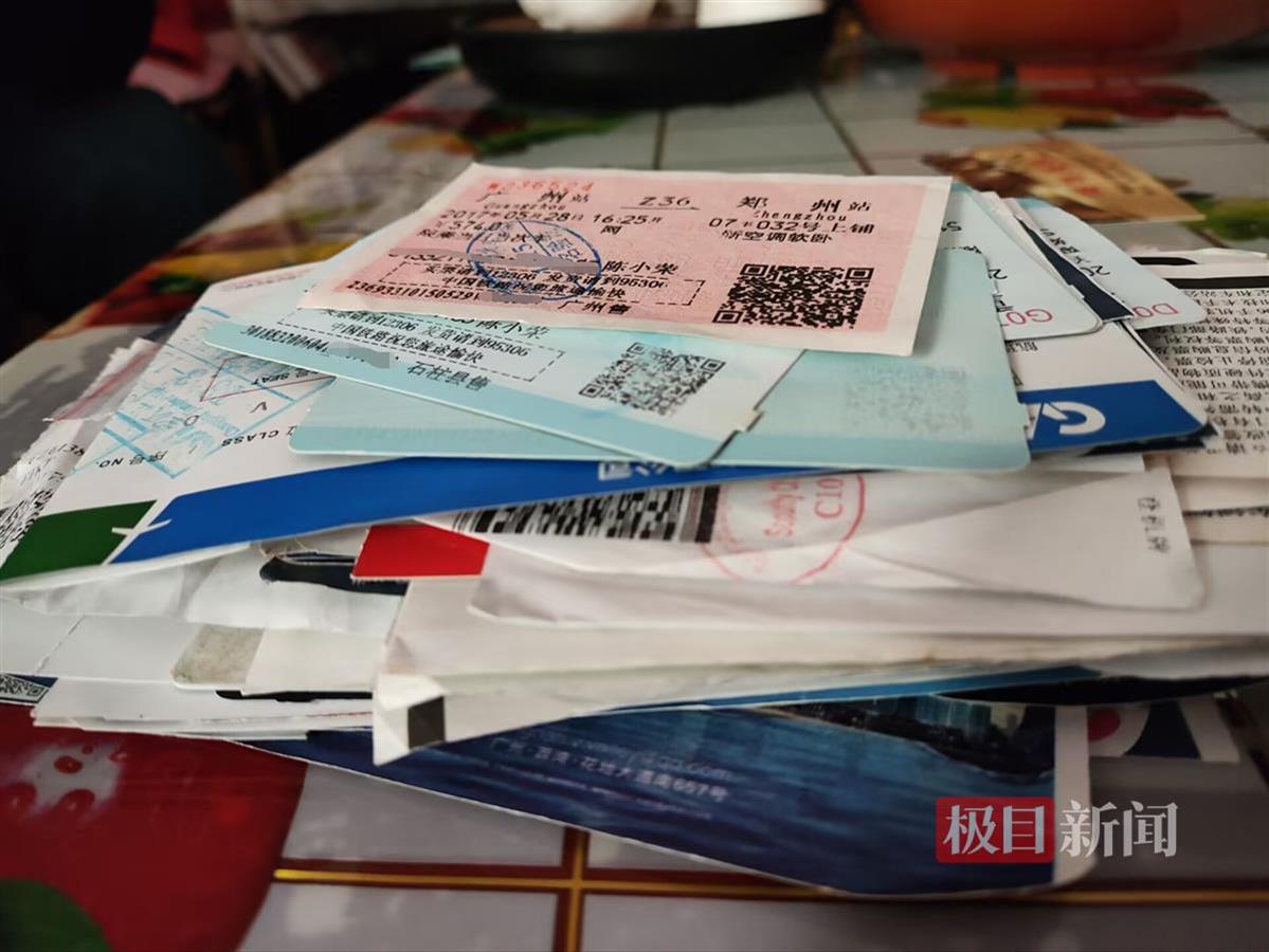 陈小荣这些年寻子积攒下来的车票飞机票,厚厚一沓