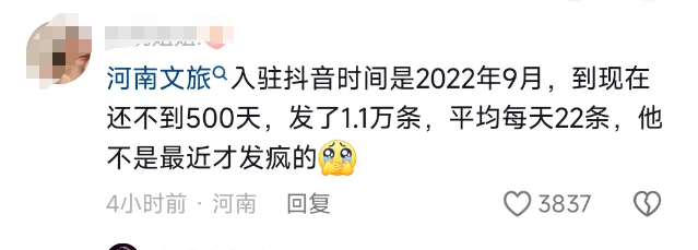 1月12日,“河南文旅到底发了多少抖音”登上热榜。有人称河南是“被大家喊话喊着急了”,还有人称“这是河南的老战术——题海战术,胜在数量”。毕竟“河南文旅注册抖音账号还不到500天,已经发了1.1万条视频”,“他不是最近才疯的”。