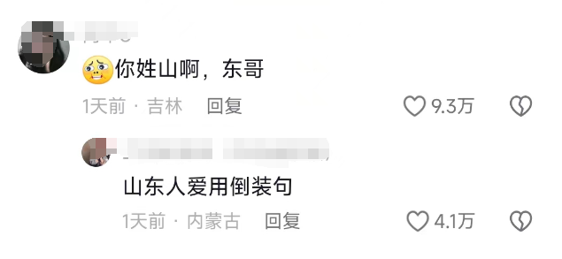 一名吉林网友称“你姓山啊,东哥”,对此,有网友回复“山东人爱用倒装句”。