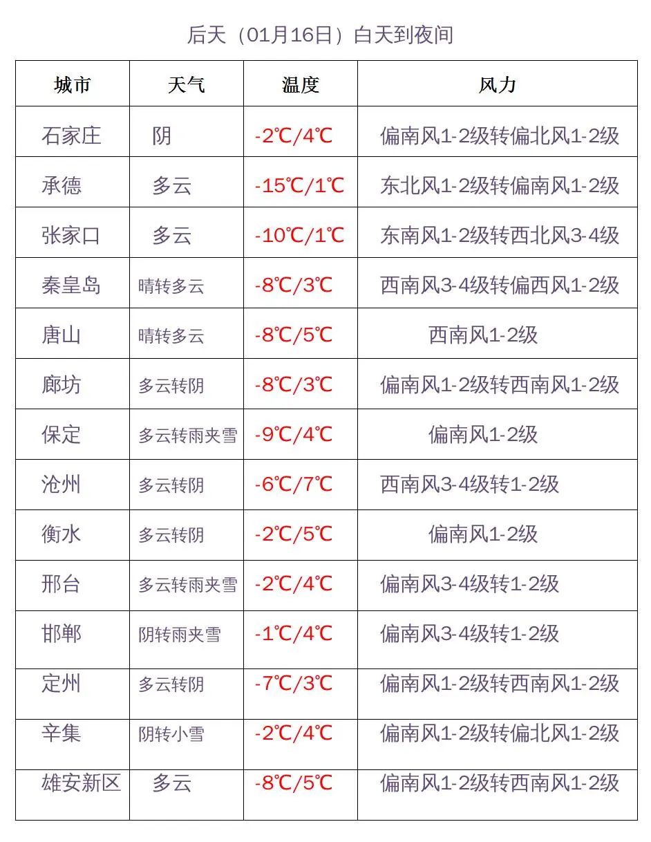 16日夜间到17日,全省多云转阴,石家庄、沧州及以南地区有雨夹雪或零星小雨,保定、廊坊以北地区有小雪或零星小雪。