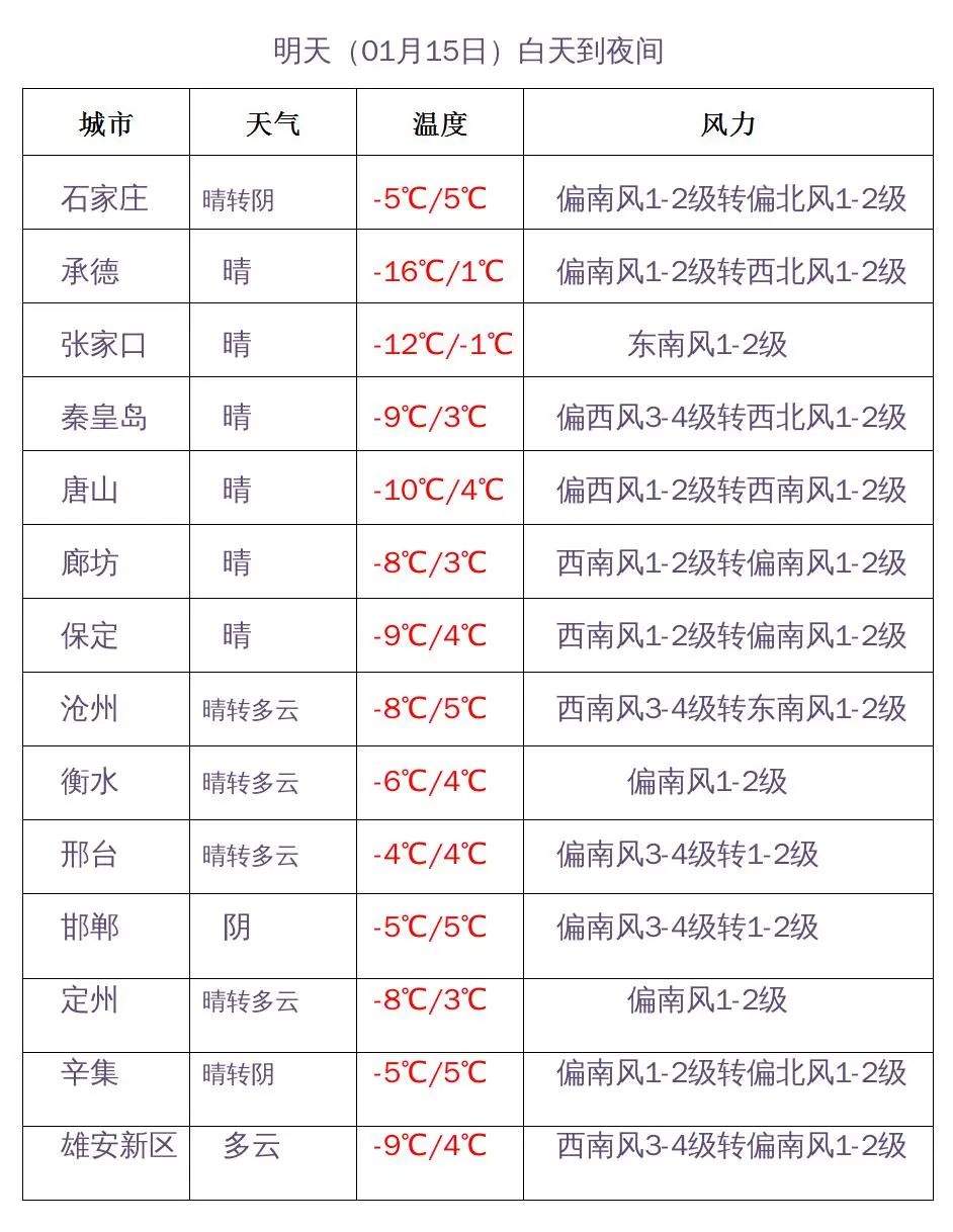 明天夜间到16日,石家庄、沧州及以南地区多云,其中邯郸短时阴有零星小雨或雨夹雪;其他地区晴转多云。