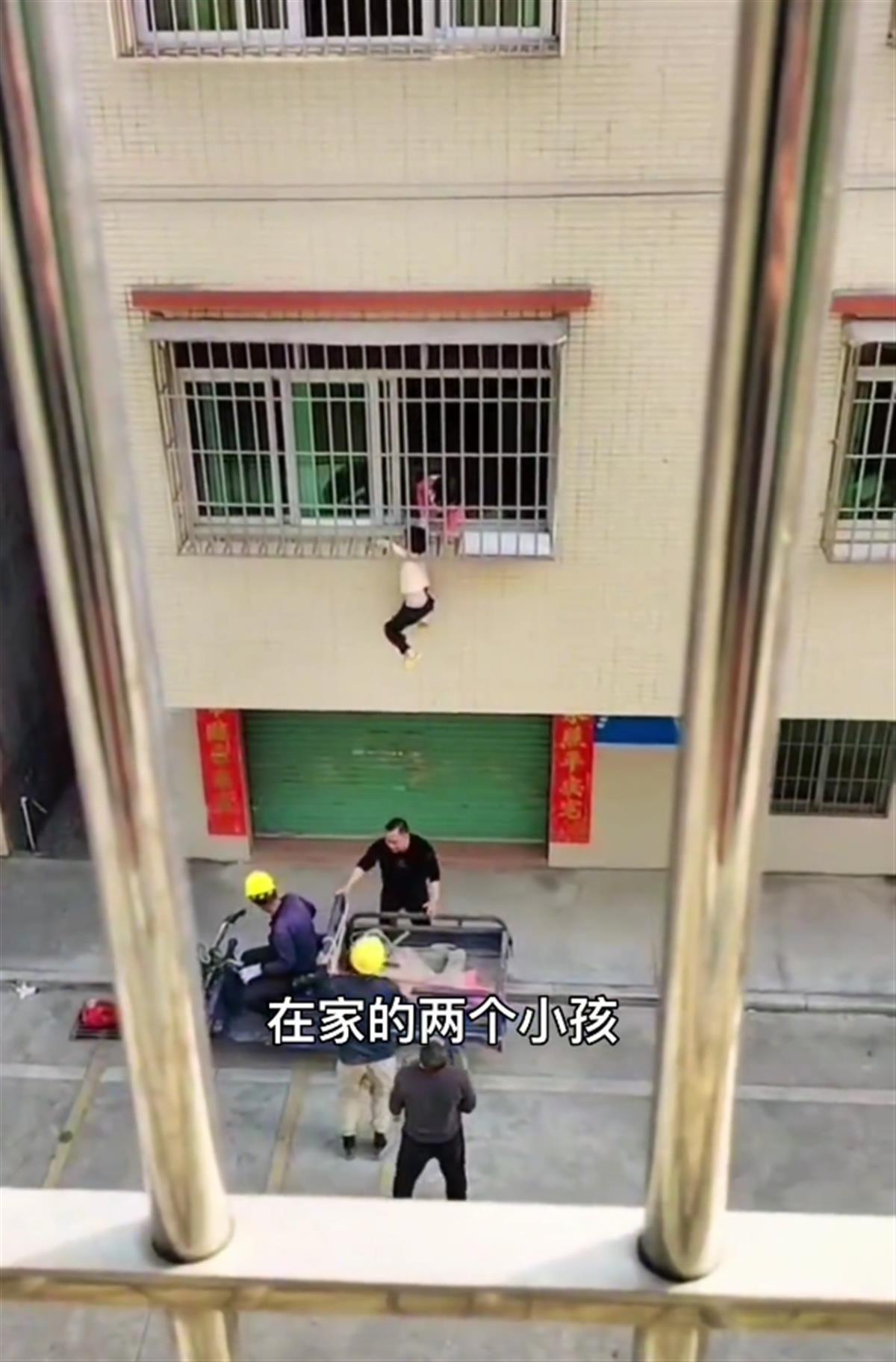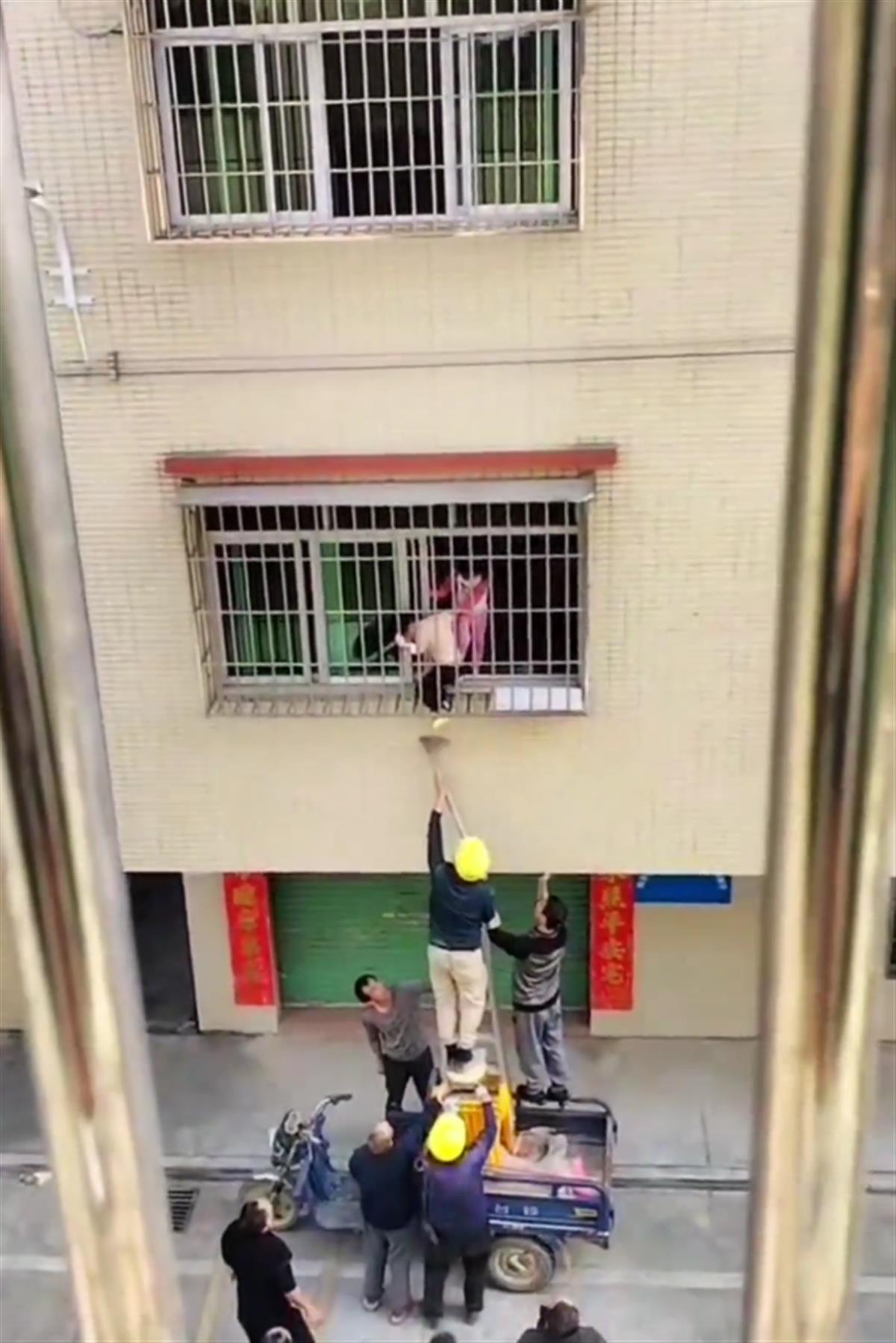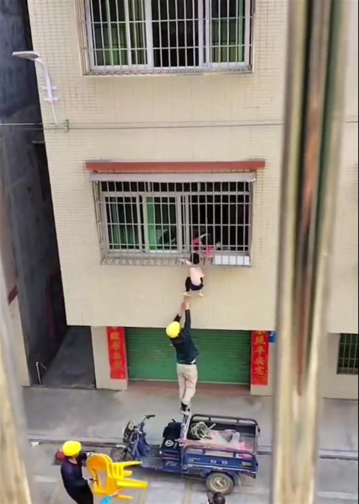 网络视频显示,一名男孩头卡在二楼窗户的防盗网里,身体悬空,双脚在空中乱蹬,发出阵阵尖叫声。屋内一名女孩试图帮男孩脱困,奈何力量有限,帮不上忙。就在此时,两名头戴安全帽的男子骑着一辆电动三轮车赶到现场,他们和另外几名群众开始对男孩展开救援。一名男子站上三轮车的栏杆,试图靠近男孩,遗憾的是因为高度差一点,未能成功。现场群众找来一架梯子和一把铲子,有人站在梯子上,用铲子撑住男孩的脚,将他慢慢送回屋内。