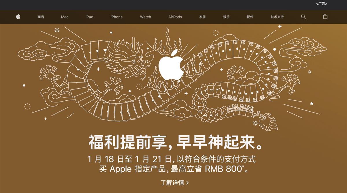 1月15日,Apple(中国大陆)官网宣布将开启迎新春限时优惠。1月18日至1月21日,在Apple Store在线商店和Apple Store线下零售店,以符合条件的支付方式买Apple指定产品,最高可优惠800元。包含iPhone15系列、MacBookAir系列、iPad系列等多款产品,每位顾客仅可购买2件参加立减优惠的产品。