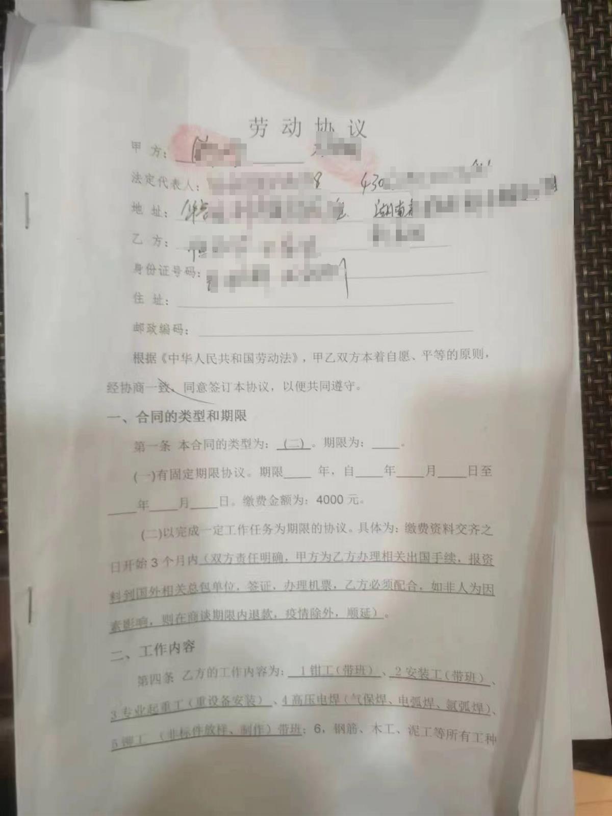 工友代表林先生称,当时签协议的时候,舒某称自己有劳务公司,执照还在办理,所以签协议没有劳务公司的签章,当时几位工友拿了他的身份证拍照,以防万一。林先生称,舒某系其一个曾一起出国务工的熟朋友介绍,便放松了警惕,没想到让这么多人上当。