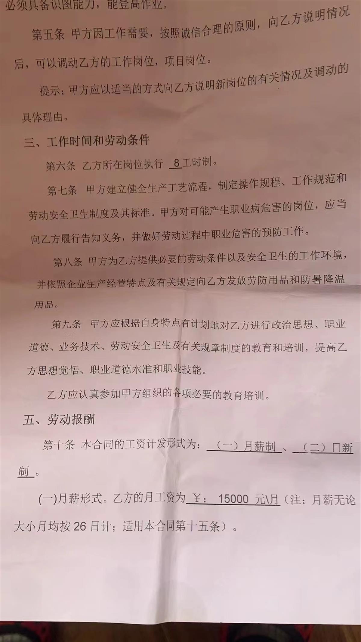 记者从工友处获得的一份《劳动协议》中,甲方即为舒某。根据该协议,工友缴费金额为4000元,工友们称为“押金”。工作内容包括钳工、安装工、高压电焊工、钢筋工、木工、泥工等工种,工资计发形式包括月薪制和日薪制。其中,月薪形式为15000元每月,每月按26日计算。