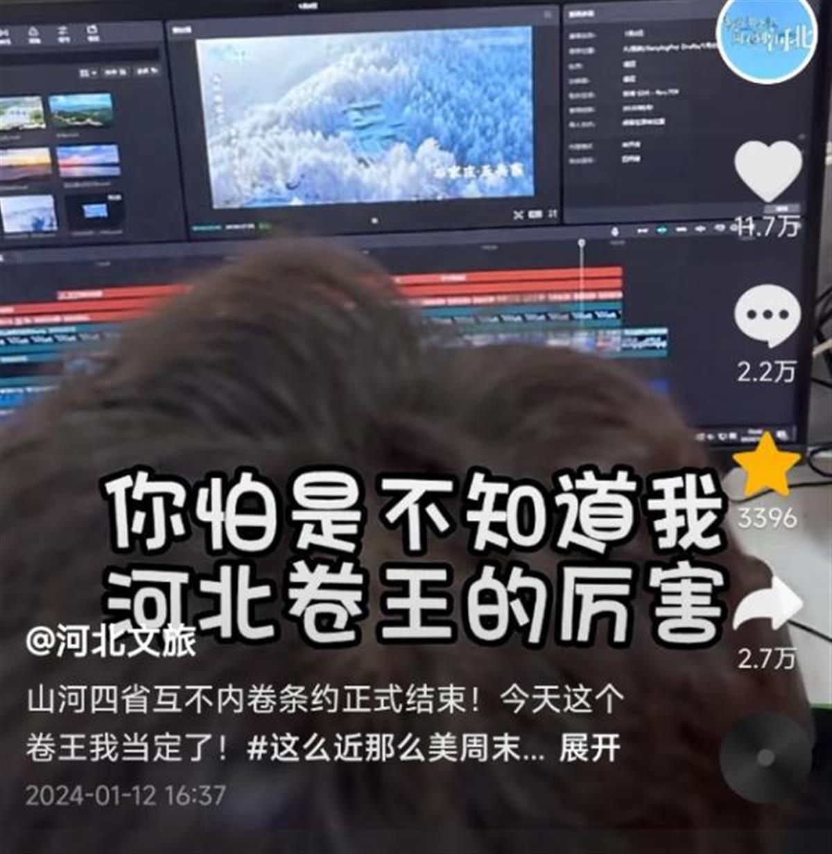 河北文旅则自称“卷王”,宣布要将“卷”进行彻底。1月12日,河北文旅局“听劝”,将其官方账号名从“河北旅游”改名“河北文旅”,并发布视频“宣战”,称“山河四省(山西、山东、河北、河南)互不内卷条约正式结束,今天这个卷王我当定了”。