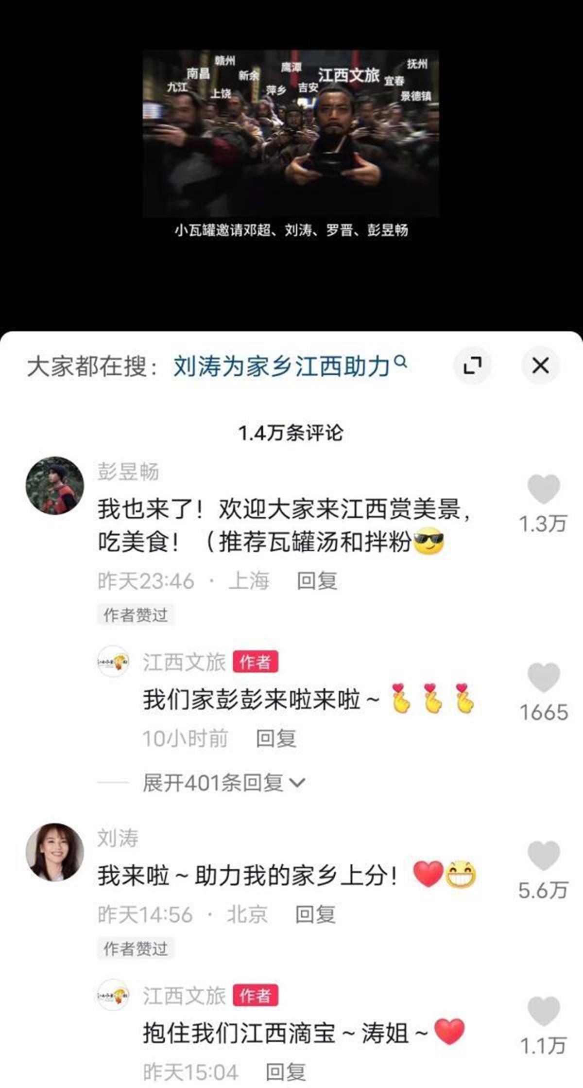 与此同时,各地文旅局还开启了“摇人”节奏:河北文旅请了赵丽颖过来“扛大旗”,四川文旅把凌云摇了出来,刘涛在江西文旅抖音官号下留言“助力家乡上分”,重庆文旅局请来肖战助力,王一博录制宣传视频推介家乡河南。