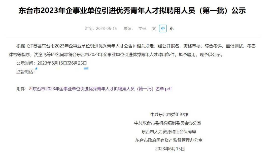 江苏省东台市2023年企事业单位引进优秀青年人才公告 东台市委组织部官网 截图