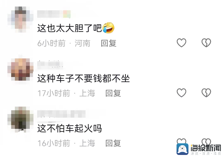 视频发出后,不少网友认为此行为太过危险,有网友表示,现在出租车大多是电车,万一着火没控制住后果不堪设想。还有人评论道:“不知道当事人咋想的,这操作没谁了。”