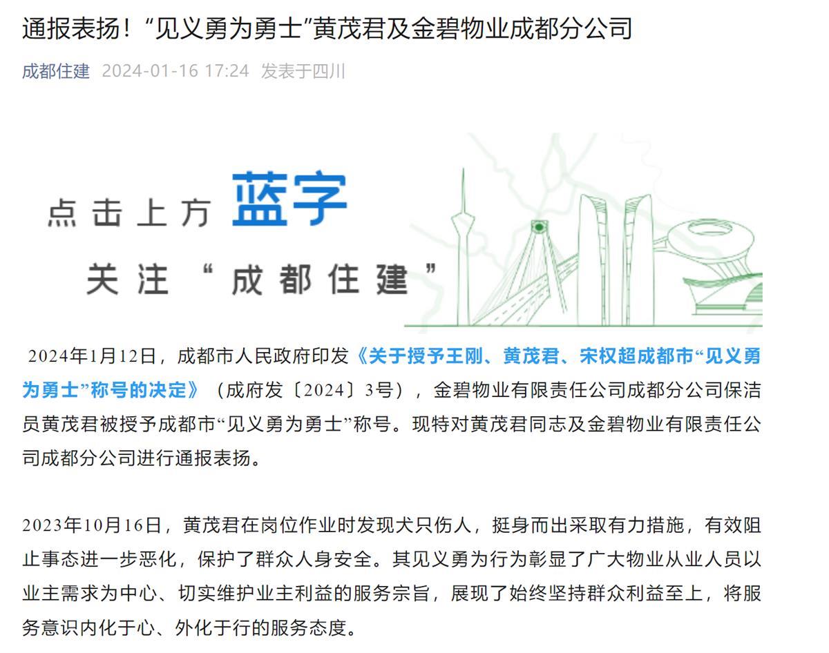 1月16日,据成都市住房和城乡建设局公众号推文,近日,金碧物业有限责任公司成都分公司保洁员黄茂君被授予成都市“见义勇为勇士”称号。2023年10月16日,黄茂君在岗位作业时发现犬只伤人,挺身而出采取有力措施,有效阻止事态进一步恶化,保护了群众人身安全。市政府决定授予黄茂君同志“见义勇为勇士”称号,既是对关键时刻挺身而出,维护业主安全行为的肯定,也是对全行业工作人员坚守岗位、服务群众精神的认可,体现了市委、市政府对住建从业人员的关心关怀。