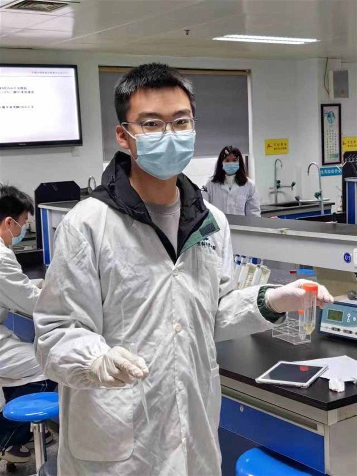 2018年,黎一鸣在华中农业大学生命科学技术学院实验室内做实验