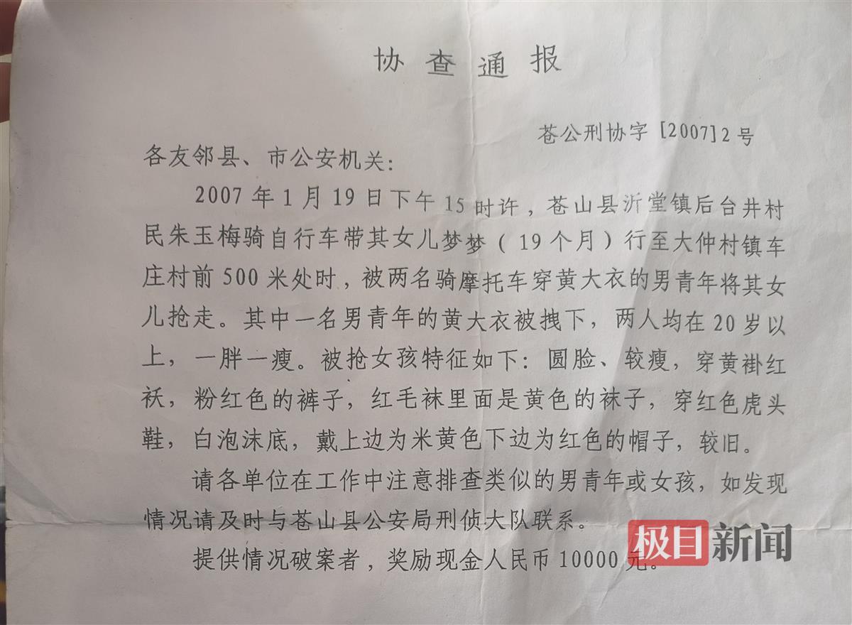 孩子被抢走后,朱玉梅因受到惊吓,瘫坐在地上,她想去报警,却发现自己站不起来,也没法骑车。后来,同村的一名亲戚骑摩托车经过,载着她去附近的公共电话报了警,报警时,朱玉梅甚至无法说出一句完整的话。当日下午,临沂市苍山县公安局刑侦大队发出了寻人的协查通报。