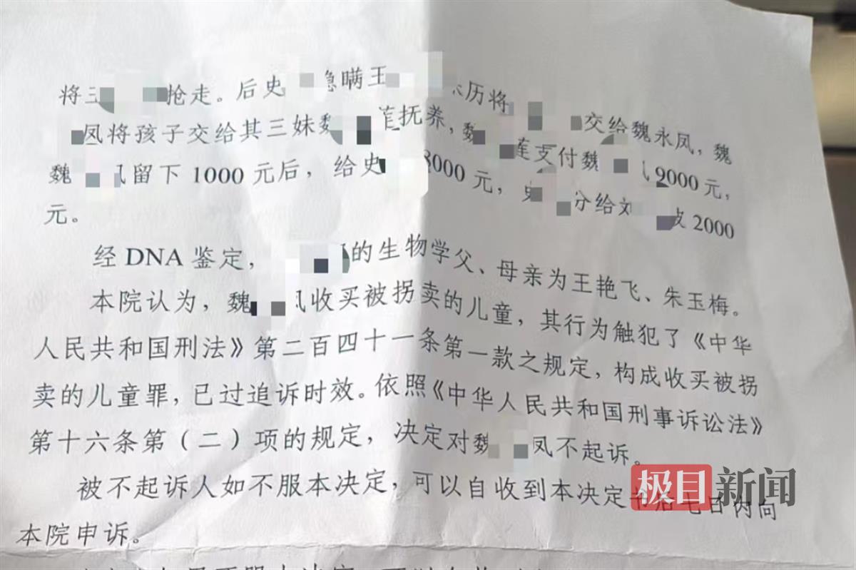 2023年11月30日,临沂市兰陵县检察院开具了一份不起诉决定书,从这份不起诉决定书上,王艳飞与妻子知道了孩子被抢走的细节。据决定书内容,抢孩子的两个人为史某与刘某波,两人与王雨养母的姐姐魏某凤是同事,魏某凤为临沂市兰山区人。