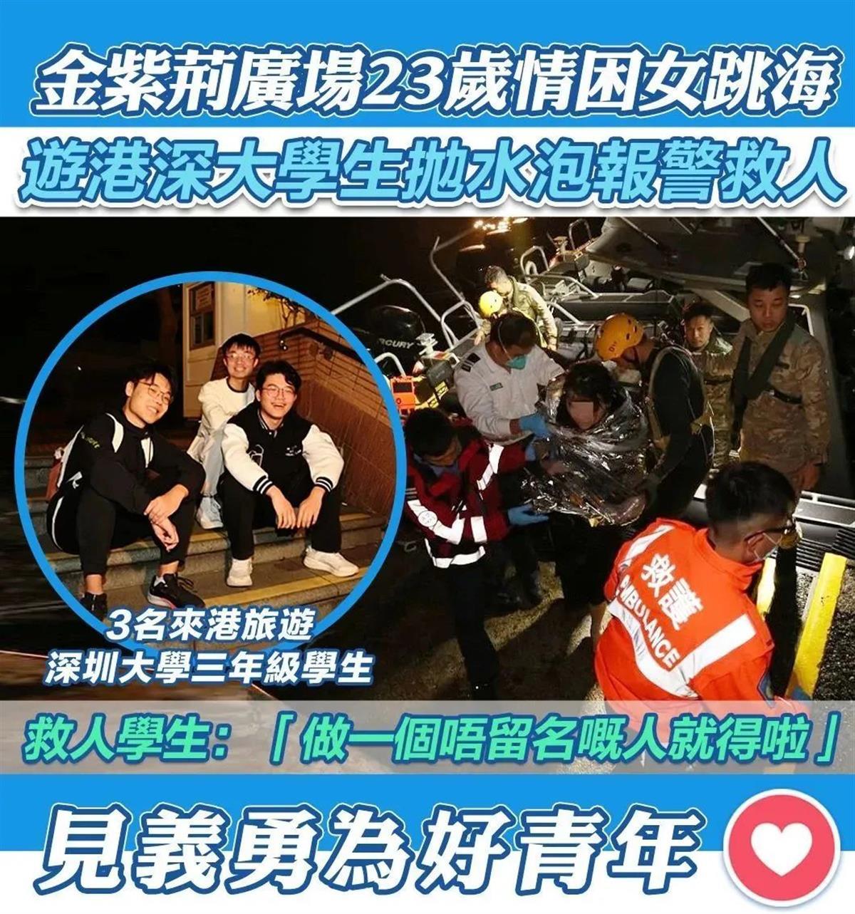 1月18日凌晨1时许,在香港湾仔金紫荆广场,一名女子突然跳海,附近三名内地游客及时抛下救生圈帮忙救助,之后警方到场将人救上岸。后经查实,三名游客都是来自深圳大学的大三学生。19日,极目新闻记者联系上其中一位救人同学何金淼,他表示自己是第一次遇到这种情况,成功救援后有一种紧张、激动之后的满足感。