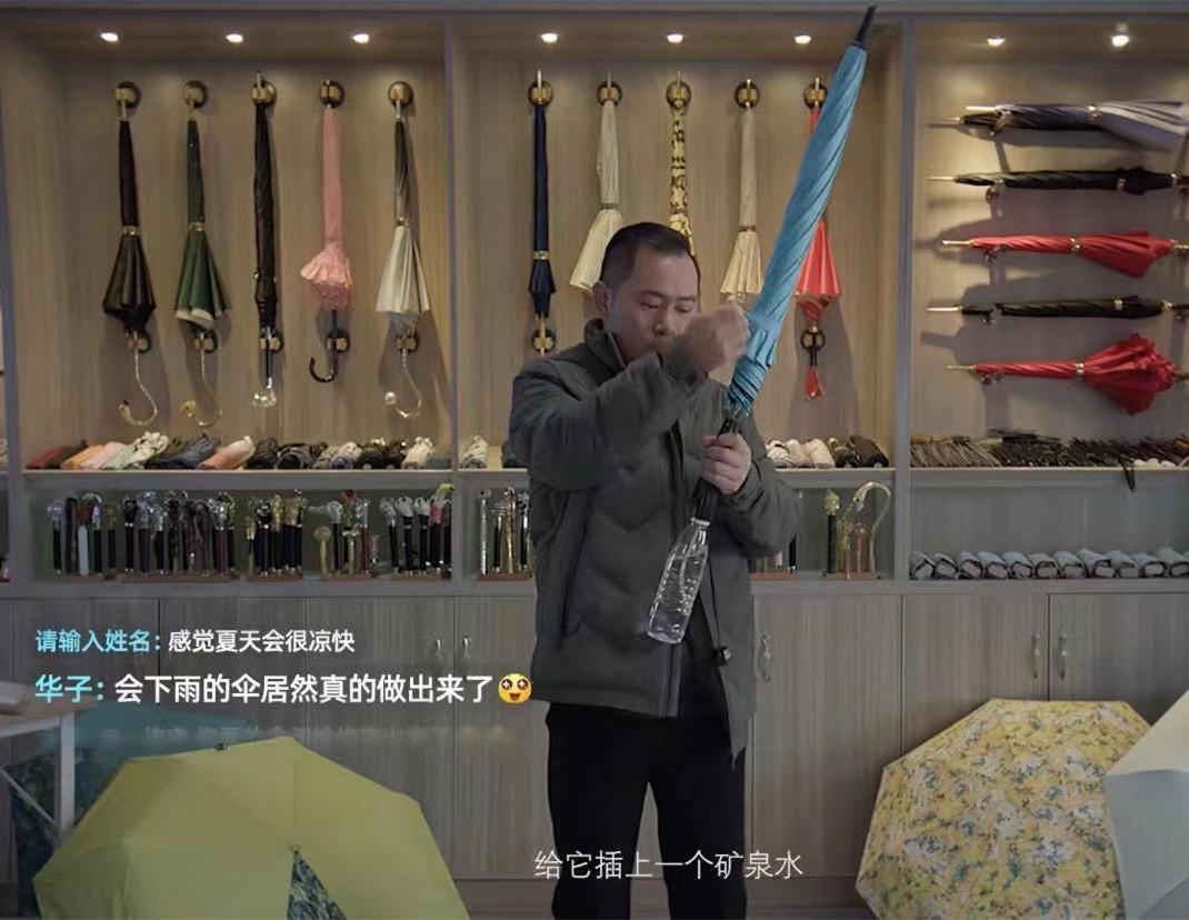 销量最好的单品,是“镭射反光伞”,销量猛增,直播数据令人满意。这款伞的灵感来自网友的留言:“叔,能不能给我做一把会发光的伞,走夜路我怕被车撞。”