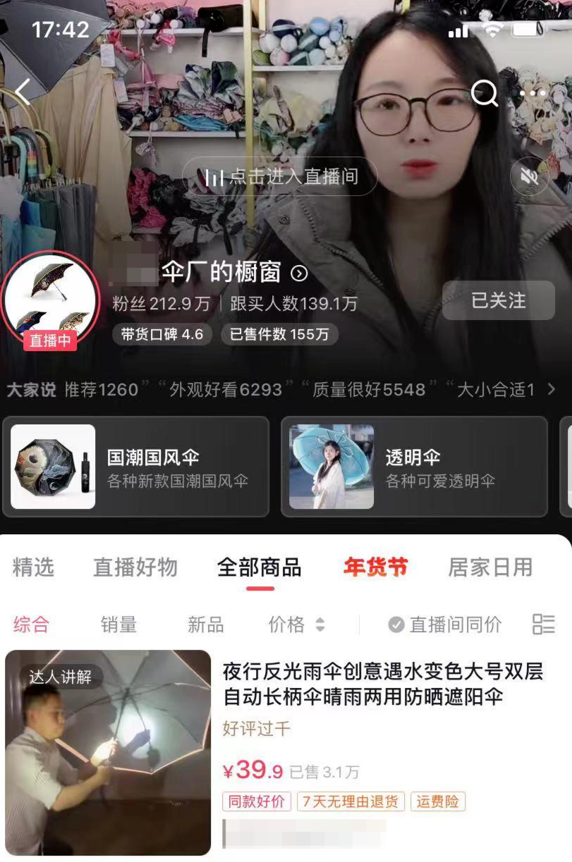 2019年,雷鹏琳开始做抖音电商。当时他的工厂类似“雨伞超市”,类型丰富,找人直播卖伞,工厂发货,但效果没有达到他的预期。“生意是有了,但是不赚钱。”雷鹏琳说。