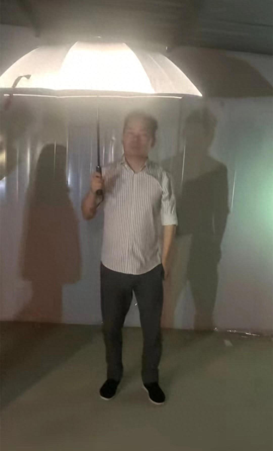 根据相关视频资料,雷鹏琳参考浇花用的喷壶,在伞柄上装一个水瓶,伞架上装一个喷洒装置,让水雾从伞的上方喷洒下来。