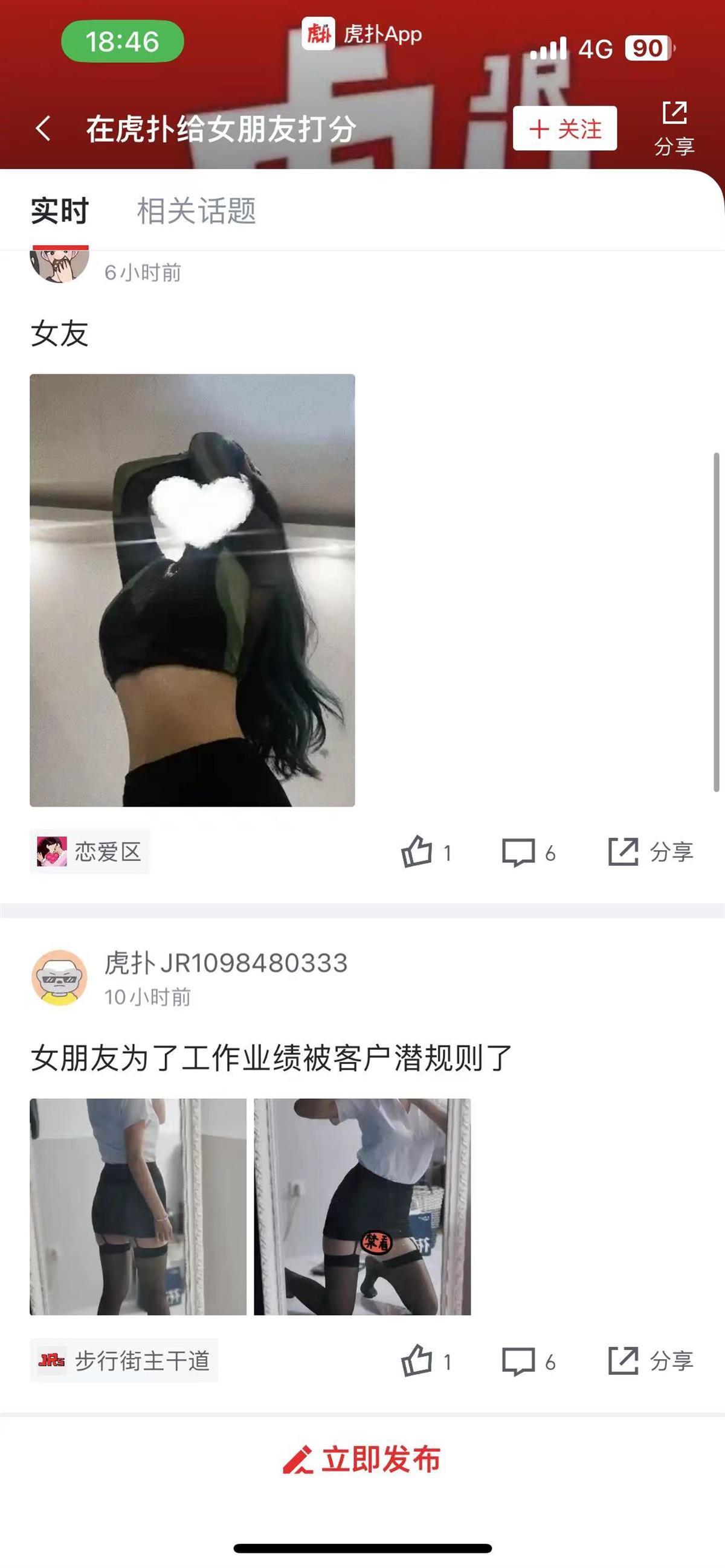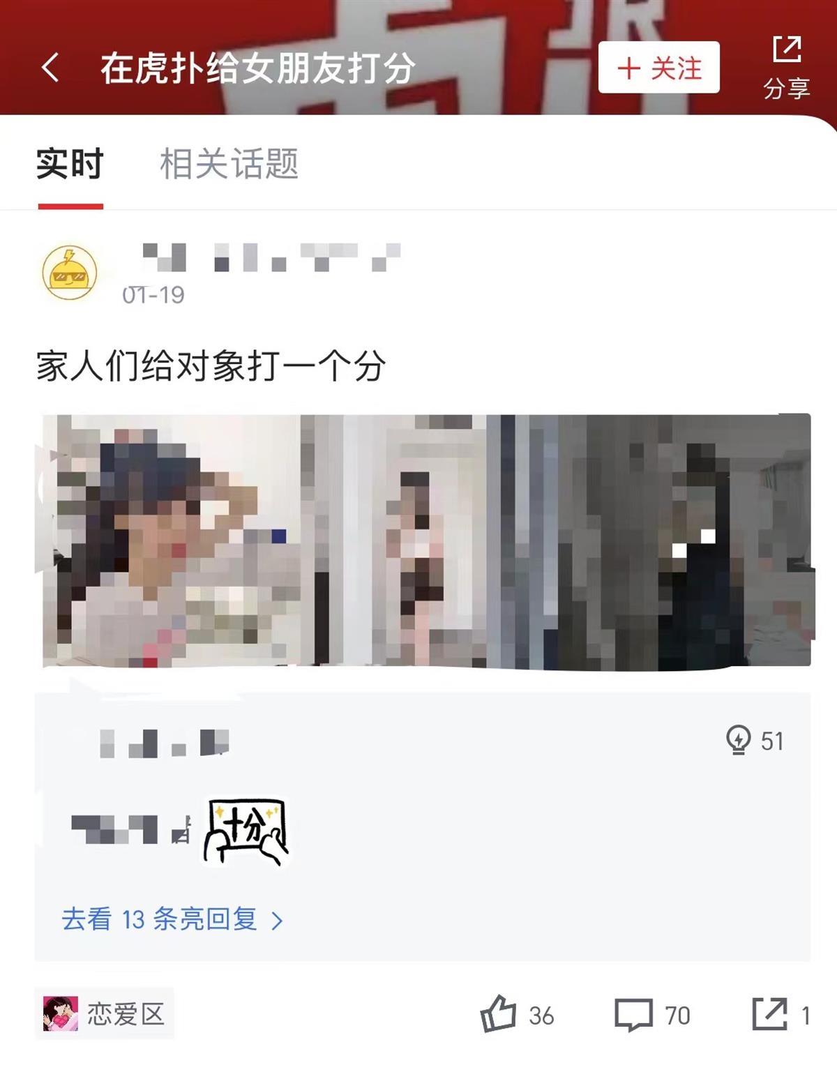 1月21日,极目新闻记者在虎扑App中看到,#在虎扑给女朋友打分#话题超3200条帖子,3.7亿阅读量,众多网友晒出女友照片“求打分”,部分帖子还有“擦边”照片及文字。