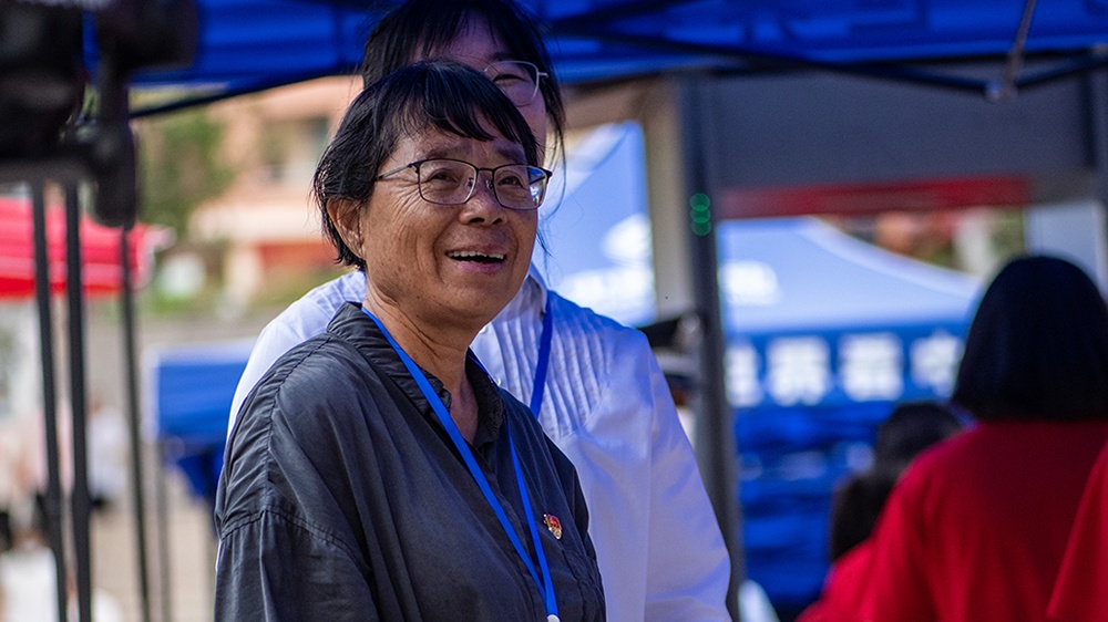 2023年6月7日,张桂梅在考点前看着学生进场待考。新华社 资料图