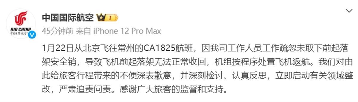 1月23日晚,中国国际航空公司发布情况说明,称1月22日从北京飞往常州的CA1825航班,因工作人员工作疏忽未取下前起落架安全销,导致飞机前起落架无法正常收回,机组按程序处置飞机返航。“我们对由此给旅客行程带来的不便深表歉意,并深刻检讨、认真反思,立即启动有关领域整改,严肃追责问责。感谢广大旅客的监督和支持。”