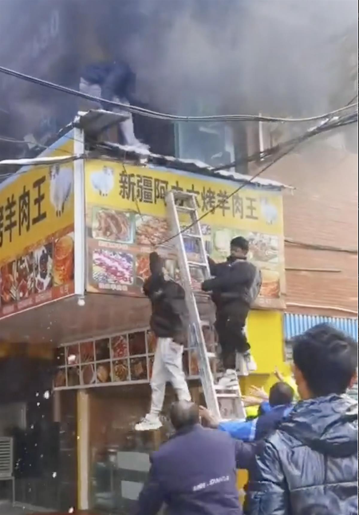 极目新闻记者获取的一段视频显示,事发时,有多名学生模样的青年从二楼阳台的窗户爬出来。楼下,一家烤肉店旁边的墙上,民警、群众等多人扶着一架梯子,这些爬窗出来的青年顺着梯子爬到一楼逃生,还有一人爬了一半直接跳了下来,摔倒在地上。上述超市老板称,这家烤肉店就位于佳乐苑的临街商铺的一楼,开业才半个月。