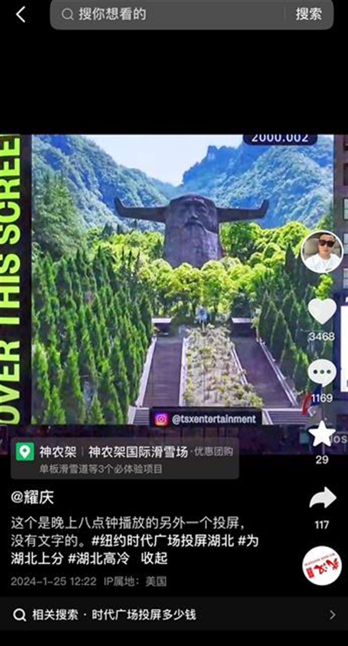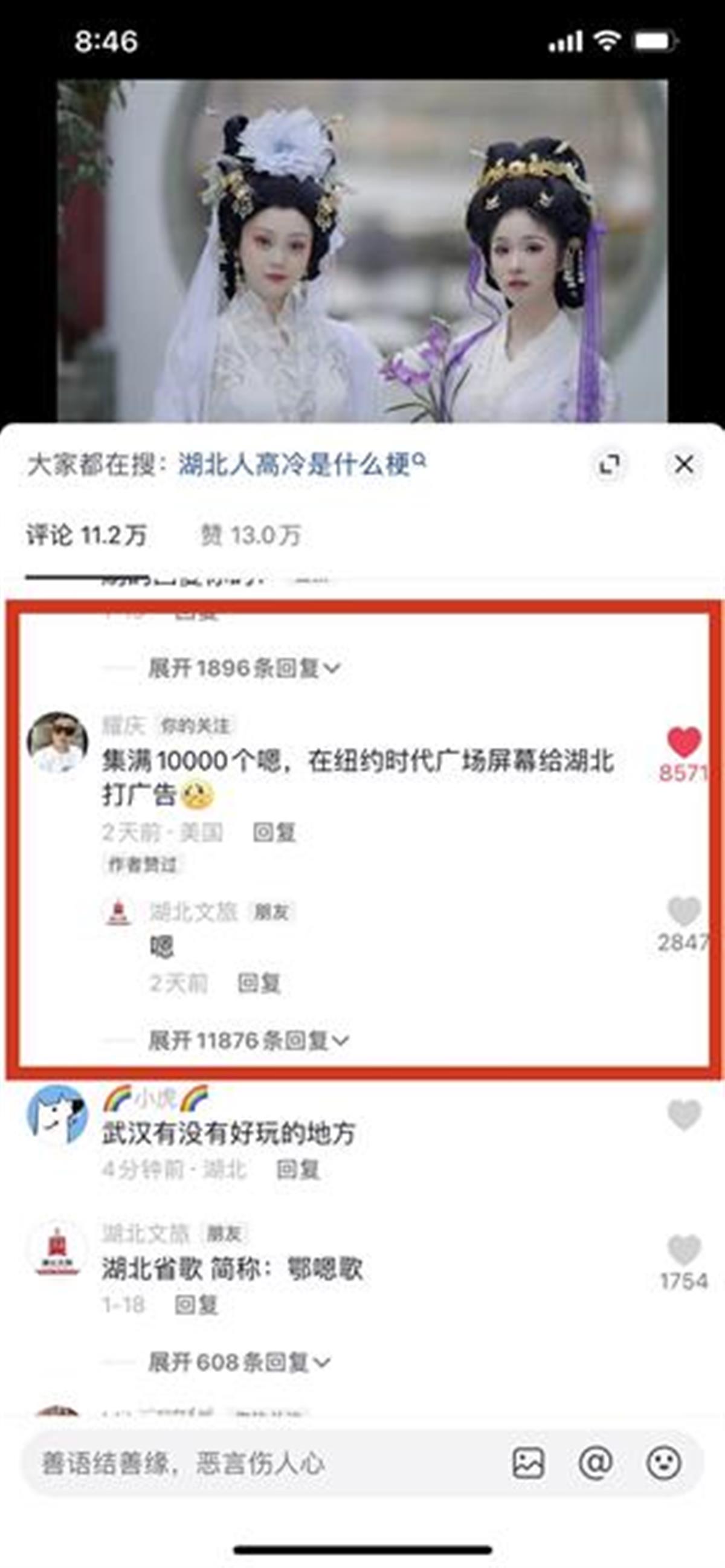 日前,一位名叫“耀庆”(IP在美国纽约)的网友,在湖北省文化和旅游厅官方抖音号@湖北文旅一条国风短视频后留言:集满10000个“嗯”,就在纽约时代广场屏幕给湖北文旅打广告。