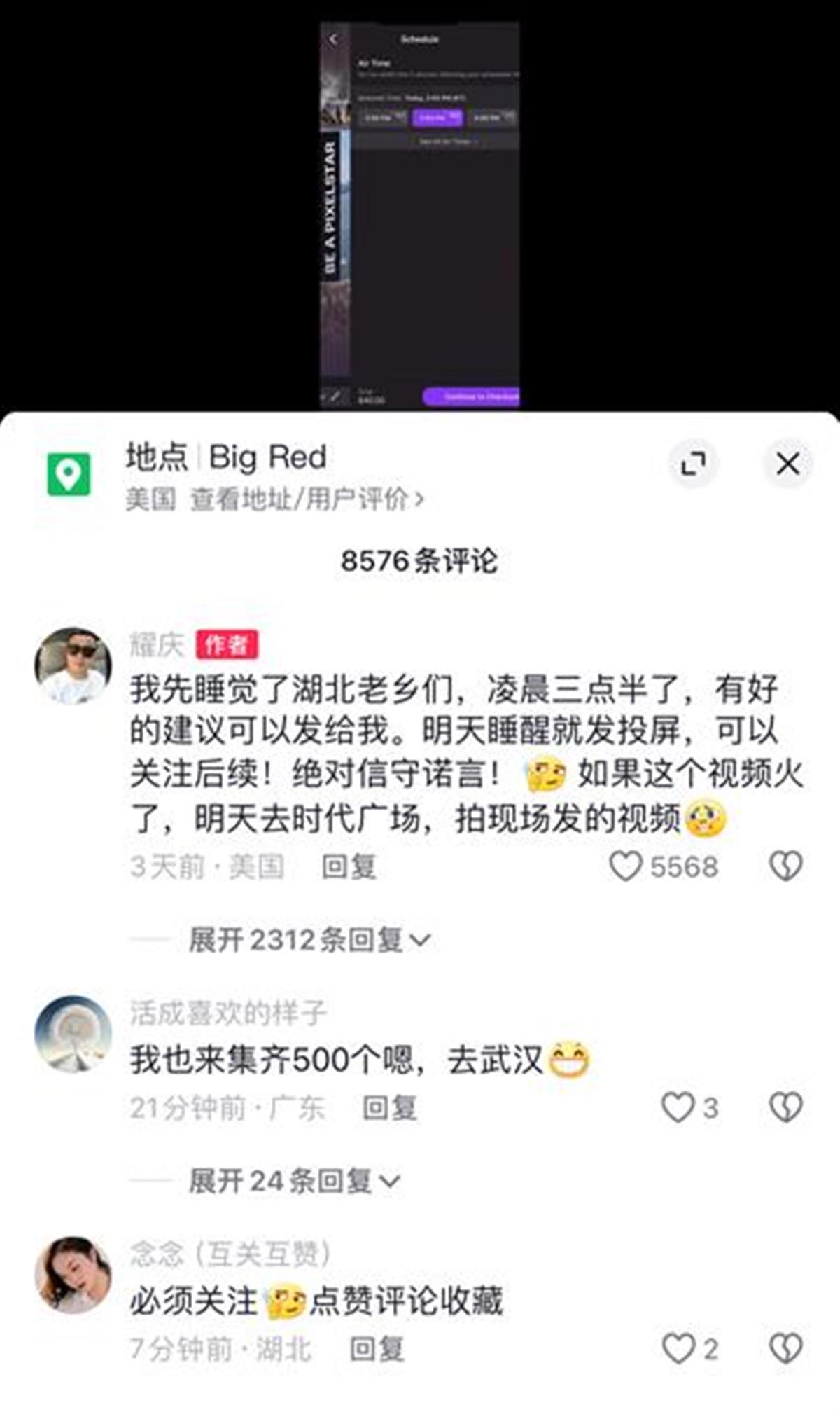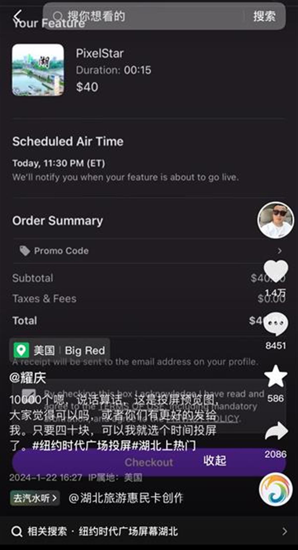 极目新闻记者看到,这位名叫耀庆的31岁网友自称是湖北荆门人。据他介绍,在纽约时代广场方形大屏上投屏一次的时间为15秒,价格为40美元,具体播放时段可以自选,通过手机即可下单,也能在手机上看到播放情况。