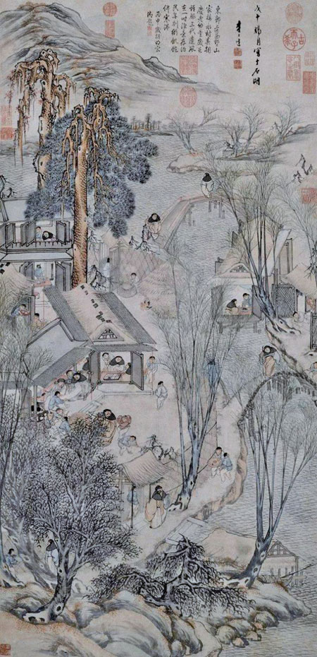 与之几乎同时代的李士达《岁朝村庆图》轴(故宫博物院藏),画的也是民间村野里的春节,同样以山水为背景,但生活气息更加浓郁,年俗活动也更为丰富。画家的题跋,表明了此图所画乃苏州石湖。画中,水道将陆地分为若干块,以桥连接,村舍多达五六处,与大大小小的院落以及篱笆围墙参差有致,形成画面的节奏感。此图总共出现了约40个人物,男女老幼皆有,身姿各异,神态生动。