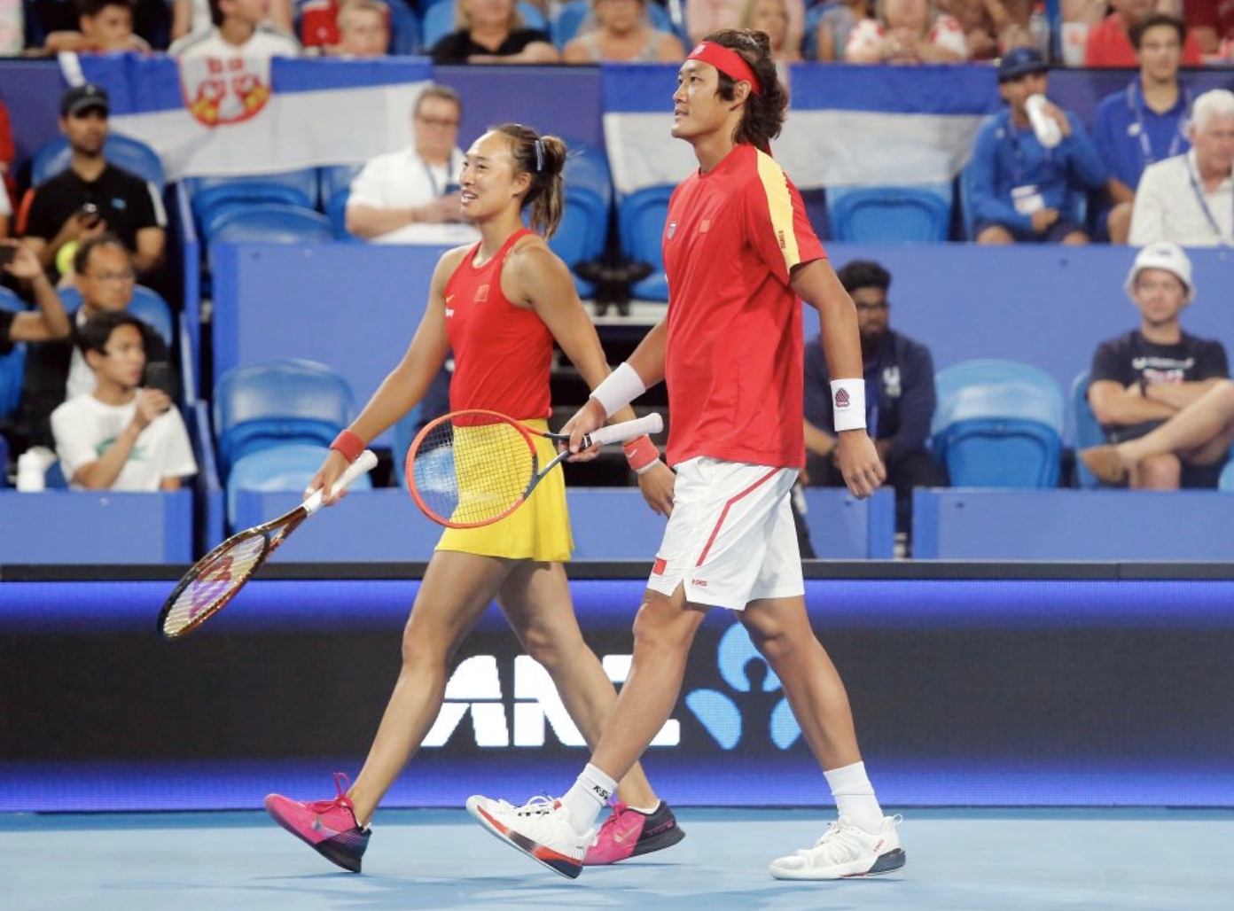2023年12月31日,中国组合郑钦文/张之臻(右)在2024年网球联合杯混双比赛中。新华社发(周丹 摄)