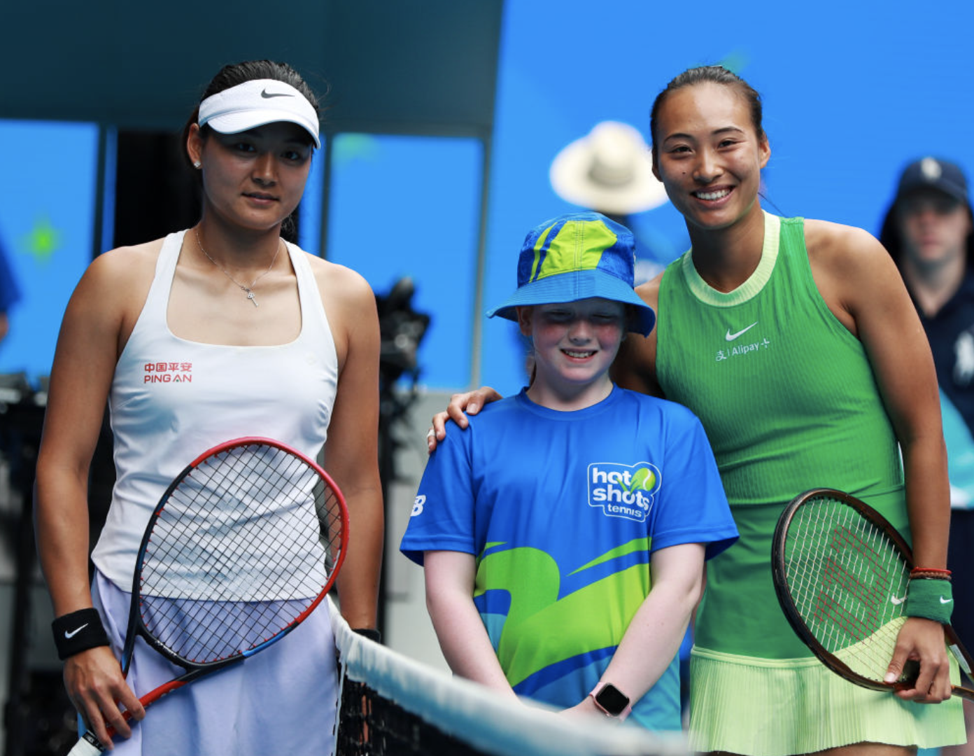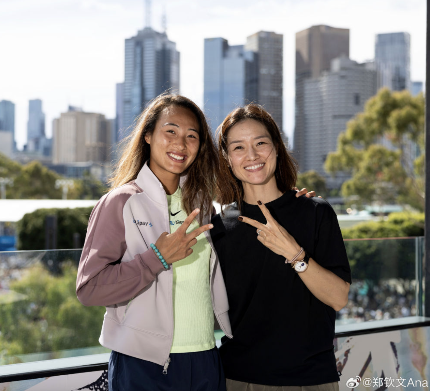 1月20日,郑钦文(右)与王雅繁在2024年澳大利亚网球公开赛女单第三轮比赛前合影。新华社记者 马平 摄