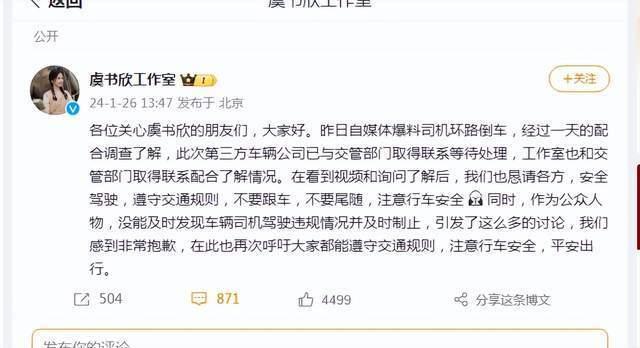 各位关心虞书欣的朋友们,大家好。昨日自媒体爆料司机环路倒车,经过一天的配合调查了解,此次第三方车辆公司已与交管部门取得联系等待处理,工作室也和交管部门取得联系配合了解情况。在看到视频和询问了解后,我们也恳请各方,安全驾驶,遵守交通规则,不要跟车,不要尾随,注意行车安全 。