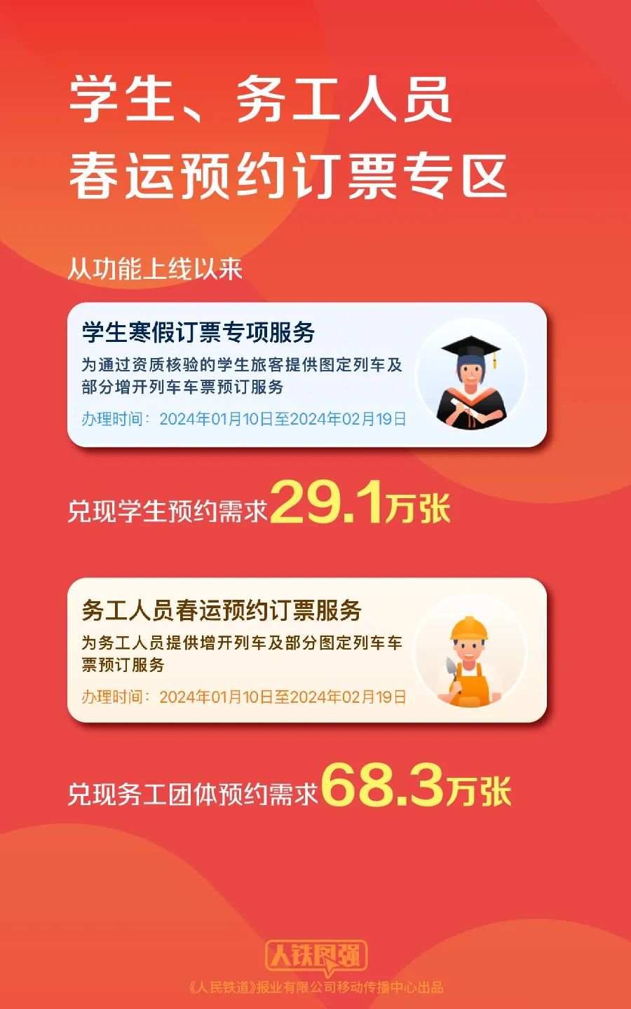 除此之外,铁路12306还为学生和务工人员推出了专区预约购票服务。学生、务工人员通过专区购买春运期间车票时,可提交开车前17天(含)以上的出行购票需求,最晚可预约3月5日的车票。