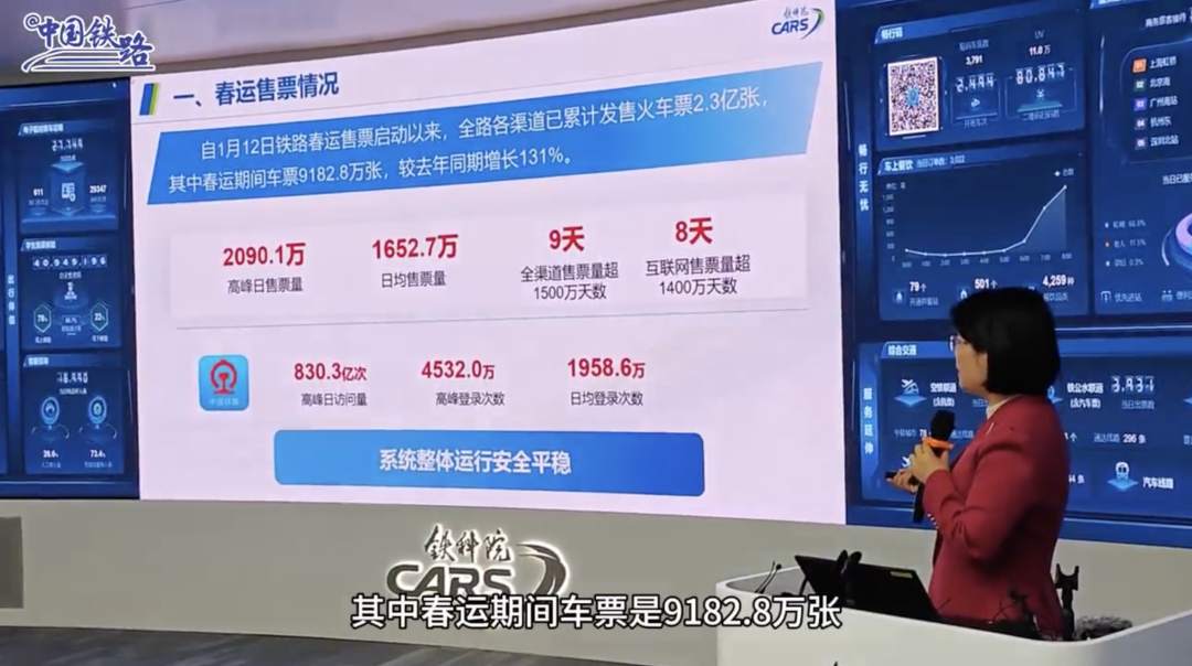 “1月25日,铁路12306发售2月8日车票,创下春运单日最高售票量2090.1万张、单日最高访问量达830.3亿次。最忙碌的一天,平均每秒钟要应对96万次的访问量。”铁路12306科创中心副主任单杏花介绍,自1月12日铁路春运售票启动以来,已累计发售车票2.3亿张,其中春运期间车票9182.8万张,较去年同期增长131%。