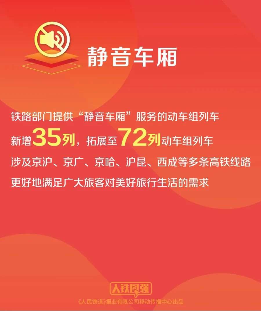 为营造文明有序、温馨舒适的旅行环境,铁路部门统筹运用动车组资源,提供“静音车厢”服务的动车组列车拓展至72列,涉及京沪、京广、京哈、沪昆、西成等多条高铁线路,更好地满足广大旅客对美好旅行生活的需求。