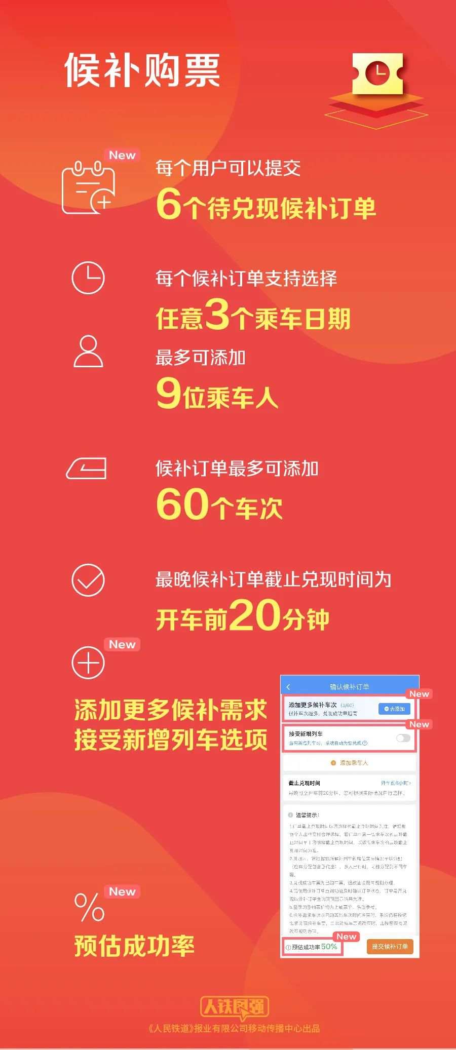 在历年春运大考中,候补购票无疑是铁路客运服务中的一项重要惠民举措。今年,候补购票功能再次优化升级。仍未买到票的旅客,可以使用候补功能,候补可以添加9位乘车人、3个不同日期,最多60个不同车次和席别的组合。如果旅客选择接受新增列车,还可以进一步提高成功率。
