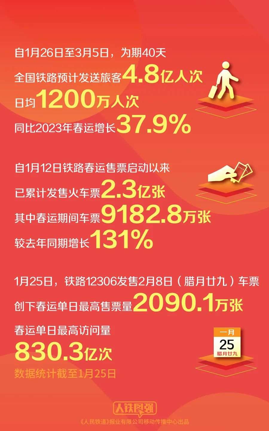 今年春运是疫情平稳转段后首个常态化春运,旅客购票出行需求旺盛。预计春运期间铁路发送旅客4.8亿人次,日均1200万人次,同比2023年春运增长37.9%。