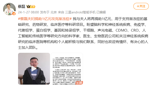 1月27日,蔡磊在微博发布消息称:我与夫人将再捐助1亿元,用于支持渐冻症的基础研究、药物研发、临床医疗等科研项目。盼望脑科学和神经系统疾病、免疫学、代谢组学、蛋白组学、基因和转录组学、干细胞、声光电磁、CDMO、CRO、人工智能和传统医学等研究方向的科学家、医生、生物医药公司和关注神经系统疾病研究的临床医院等机构和个人能积极与我们联系,同时也欢迎有情怀、有决心的人士加入团队。