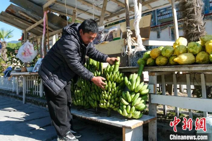 2023年12月19日,墨脱县门巴族次仁旺加在村口路边摊位上码放香蕉,这些墨脱特产主要向路过的游客销售。
