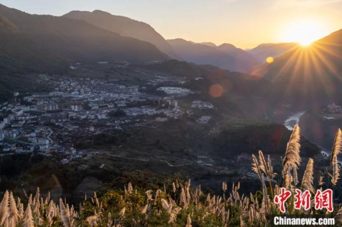 傍晚时分,从墨脱县城可以看到“日照金山”景观。
