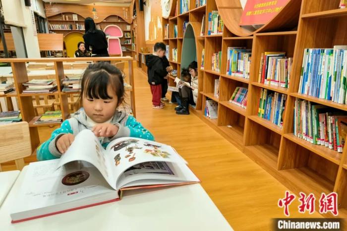 2023年12月22日晚,墨脱县新图书馆儿童区,一位孩子翻看图书。