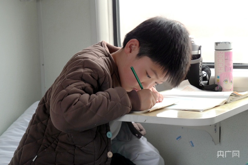 孩子正在列车上写作业(央广网发李艺摄)
