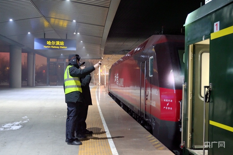 秒针不停转动,分针走过20多圈,次日23时56分,列车到达哈尔滨站,室外与车厢内的温差高达40多度,胡克军、张勇波两人穿戴整齐,在2名添乘工作人员的指导下进行作业,为安全返程做准备。