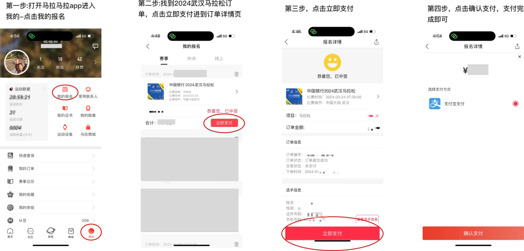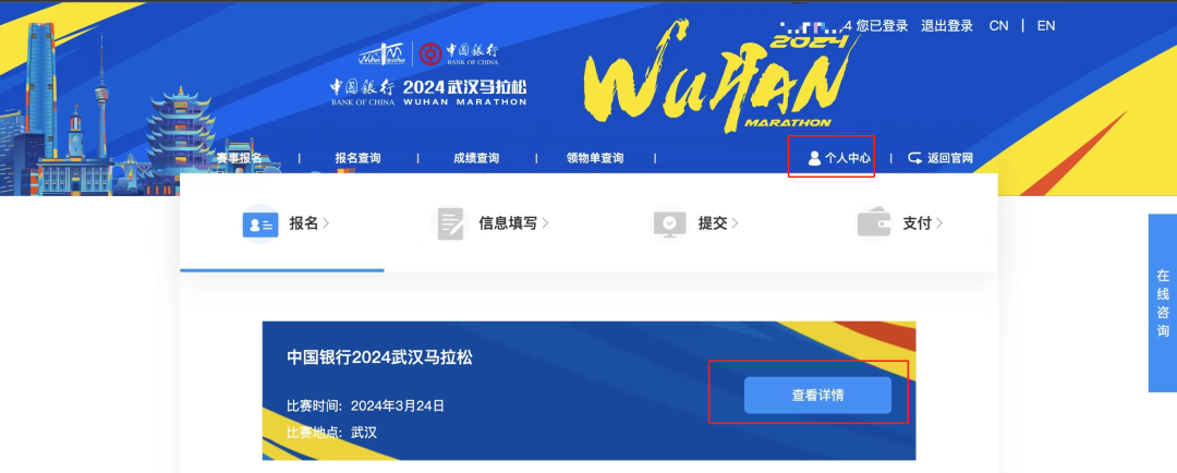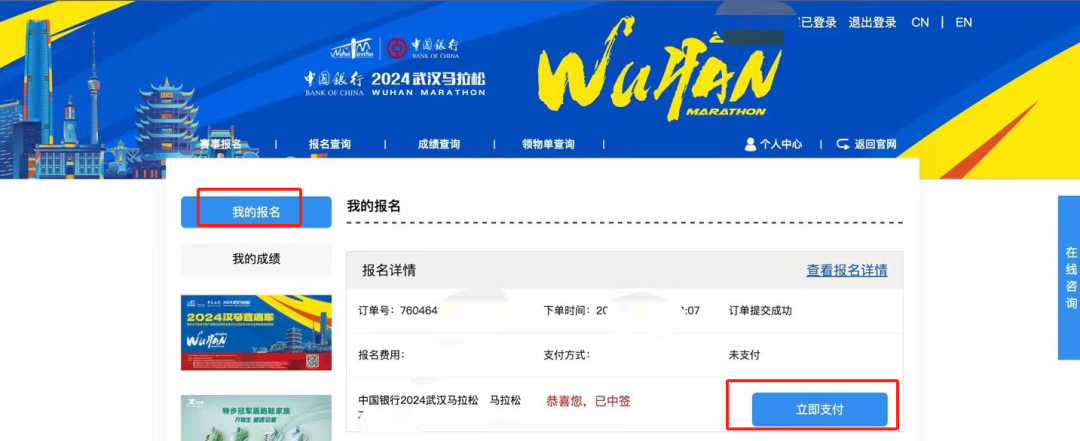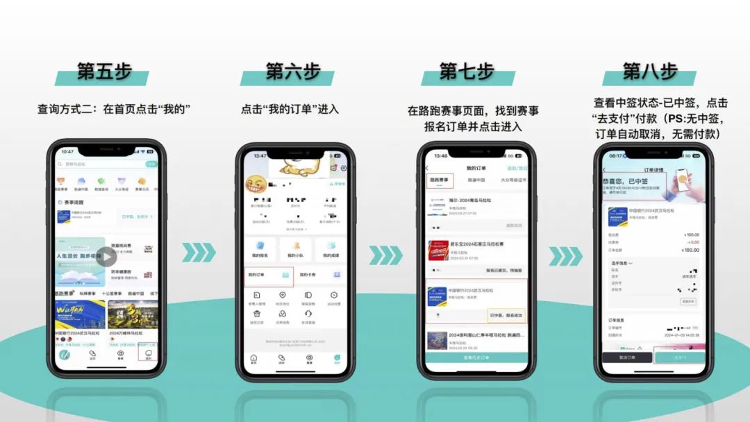 进入武汉马拉松官网(www.wuhanmarathon.org)点击“中签查询”,进入报名系统登录页面,登录后点击右上方“个人中心”查询中签结果。中签选手应按照页面提示进行缴费。