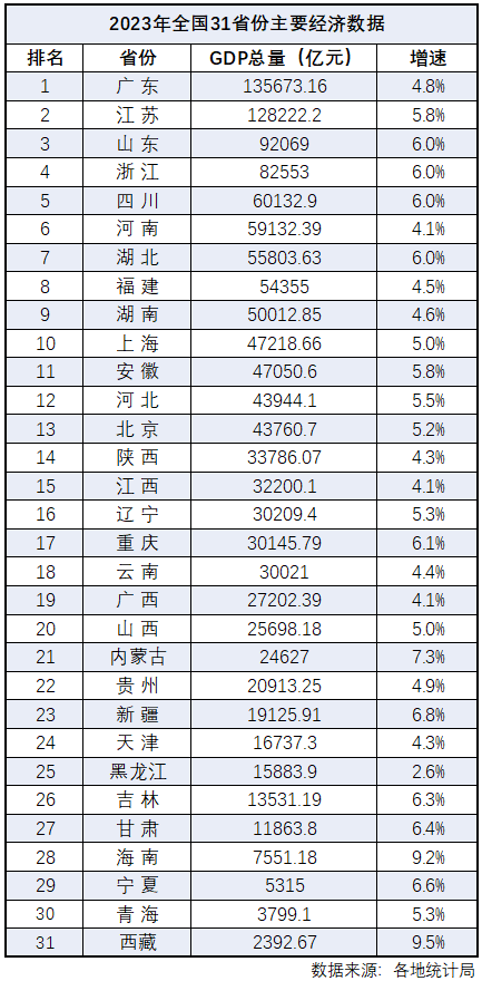 随着新疆发布2023年经济运行情况,全国31个省(区、市)2023年全年GDP相关数据已全部出炉。